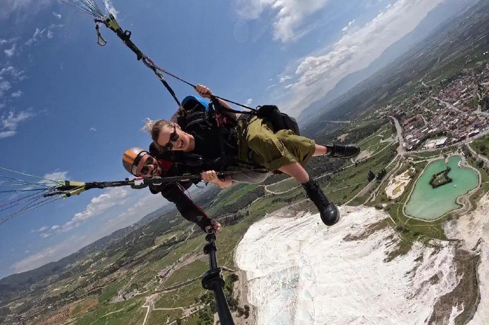 我们的棉花堡双人滑翔伞探险之旅从山顶开始,降落在位于我们办公室正前方的着陆点结束。